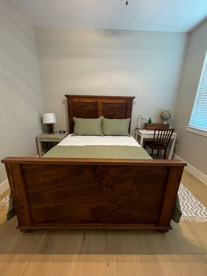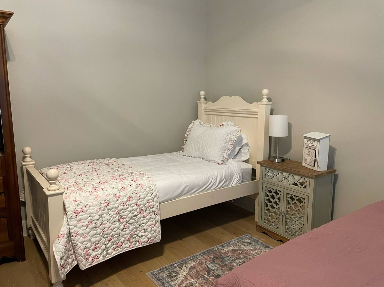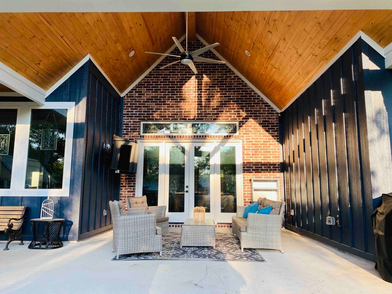 The large bricked front porch invites you into our farmhouse cottage features 4 bedrooms and 3 bathrooms, each decorated in a different color. The Brown Room and has a king bed, tv, and en suite bathroom with a walk-in shower, soaking tub and double vanity. The Blue Room has a king bed and en suite bathroom with a single vanity and walk-in shower. The Green Room has a work space with a desk and a queen bed. The Pink Room has two queen beds and a twin bed. The Green and Pink Rooms share a bathroom that has a separate toilet/shower/tub room and a double vanity. The fully equipped kitchen is perfect for gatherings and there is plenty of eating space between the breakfast area, dining area and island seating. There is also a laundry room available for use if needed. The large back porch is available to hang out and enjoy the beautiful backyard or a BBQ. There is a TV on the back porch available for use.